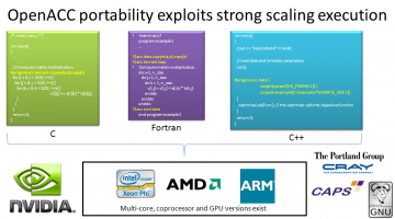 OpenACC lets you program in parallel C/C++ and Fortran in a manner that is concise and where the same source code can be recompiled to run on AMD GPUs, NVIDIA GPUs, Intel Xeon Phi, x86, and ARM. View at Dr. Dobbs (http://www.drdobbs.com/parallel/easy-gpu-parallelism-with-openacc/240001776) This is the first in a series of articles by Rob Farber on OpenACC directives, … [Read more...]