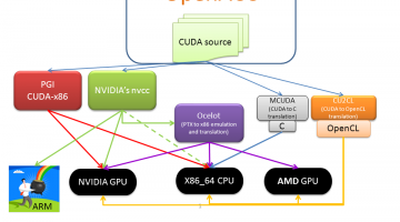 Various pathways exist to run CUDA on a variety of different architectures. The freely available gpuOcelot project is unique in that it currently allows CUDA binaries to run on NVIDIA GPUs, AMD GPUs, x86 and Intel Xeon Phi at full speed without recompilation. It works by dynamically analyzing and recompiling the PTX instructions of the CUDA kernels so they can run on the … [Read more...]